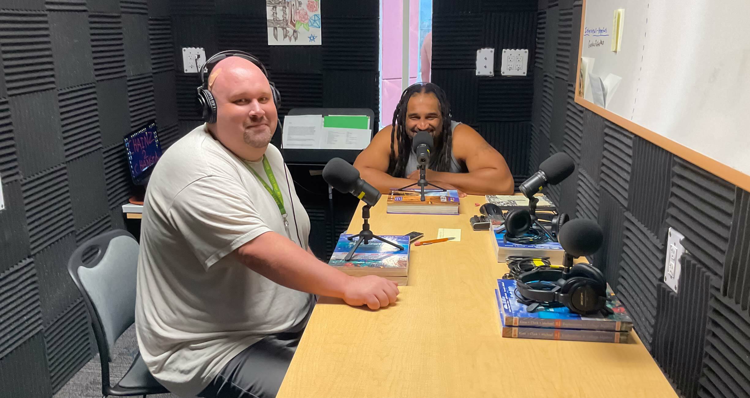 Schmidkunz and Stridiron—who have known each other for 16 years—started recording Chainz 2 Changed in August 2023 from a converted cell. Foam panels, which residents helped install, cover the room’s walls to help with soundproofing. A large dry-erase board mounted on the wall lists episodes planned for the podcast’s first season and ideas for upcoming interviews. Schmidkunz has scribbled a quote on the board: “Is what we are doing today making the world a better place??”